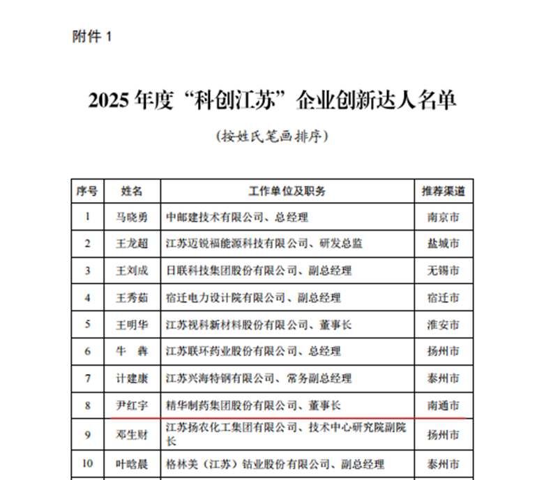 近日,由江苏省科学技术协会、科学技术厅、总工会及工商业联合会共同开展的2025年度“科创江苏”企业创新达人选拔活动正式公布入选名单。精华制药集团股份有限公司党委书记、董事长尹红宇凭借在推动中医药现代化传承与创新、引领企业高质量发展方面的突出贡献,经过严格地形式…